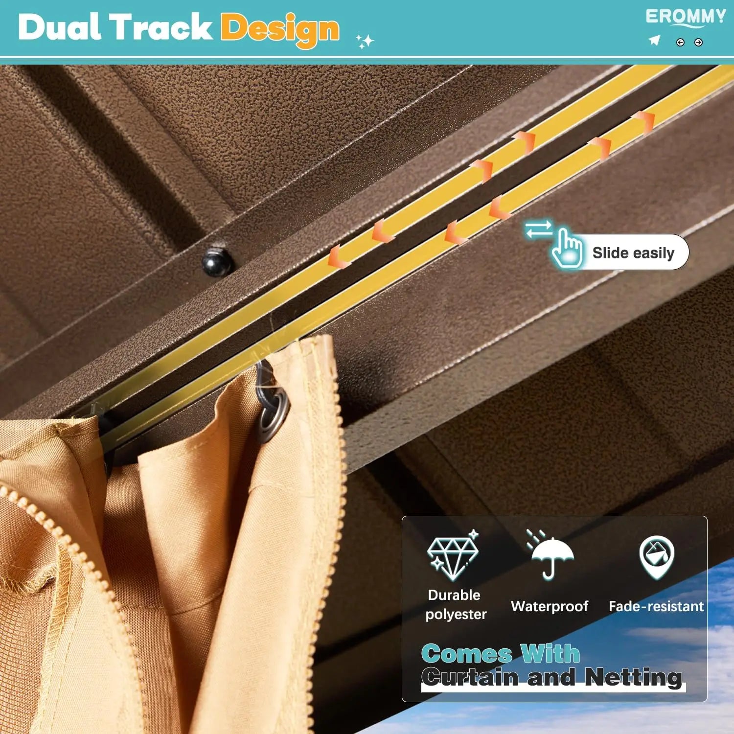 - Fully enclosed netting and curtains with a double-track system offer privacy, sun protection, airflow control, and easy access for family, friends, and pets.