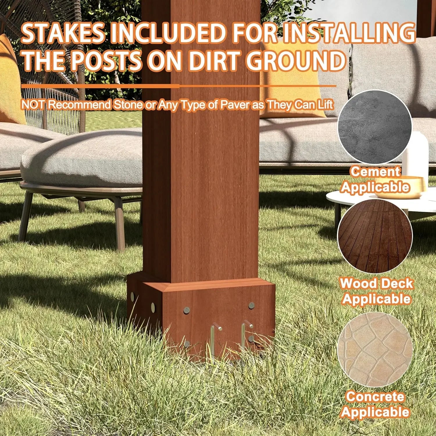 - Stakes are included to anchor the pergola to grass, wood deck, or cement, with expansion screws (not included) available if you want extra stability.