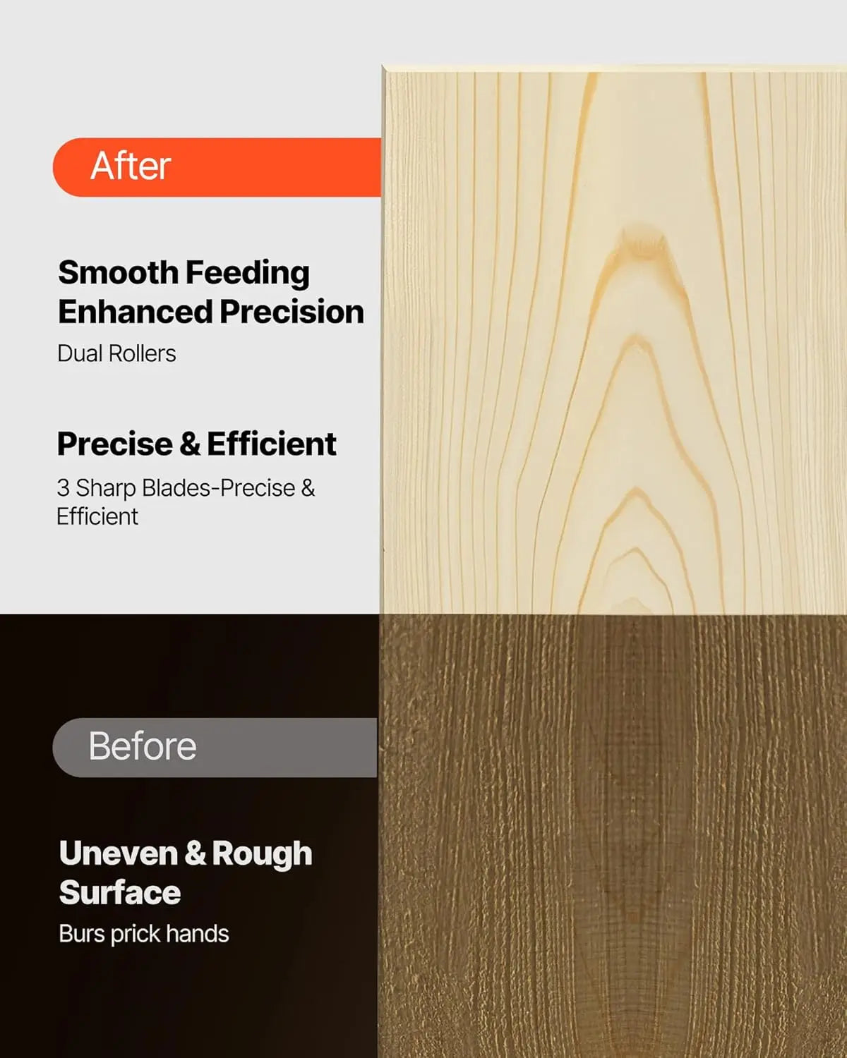 - Dual-Roller feeding system ensures you achieve precise board advancement with reduced vibration and fewer alignment issues, while three sharp HSS blades deliver glass-smooth edges.