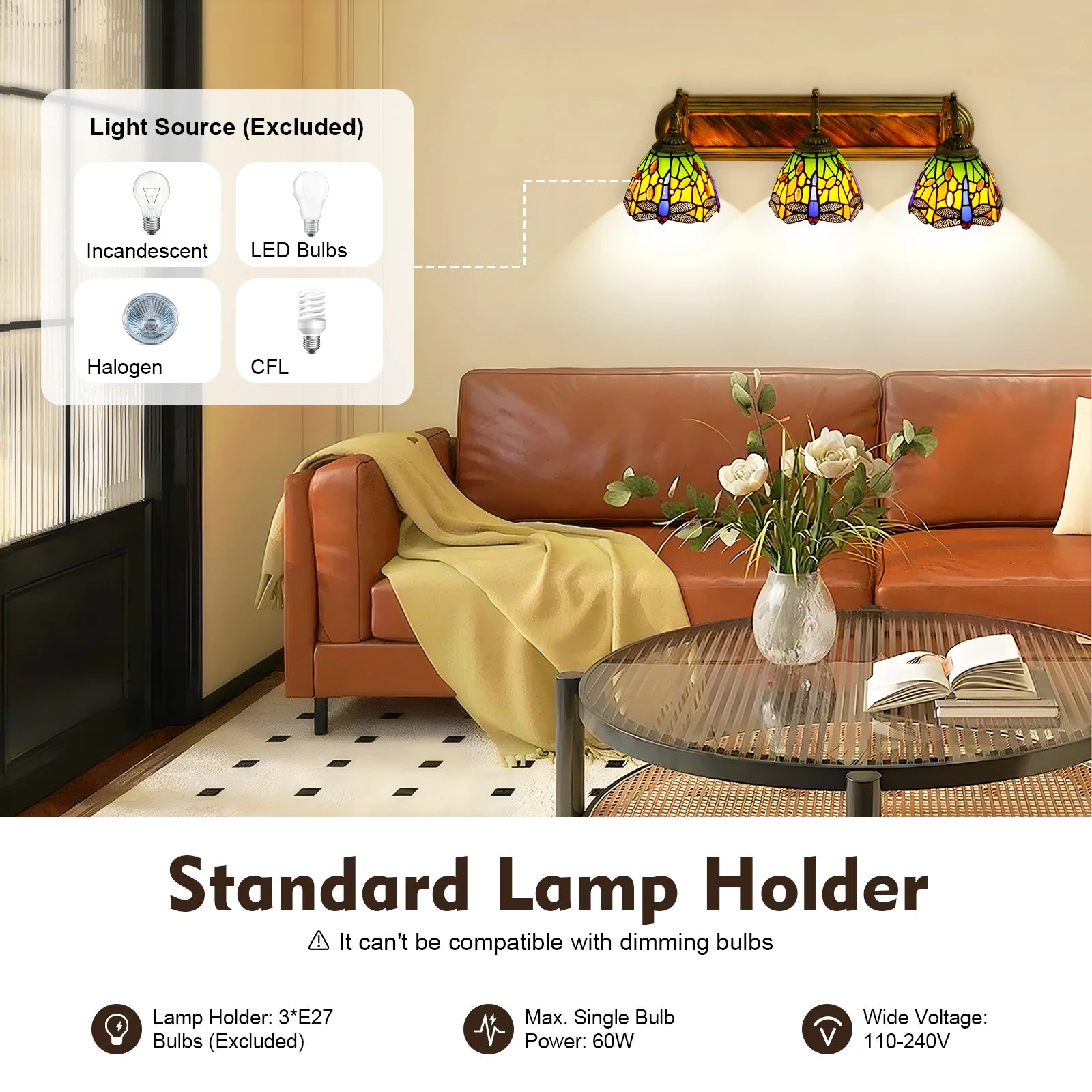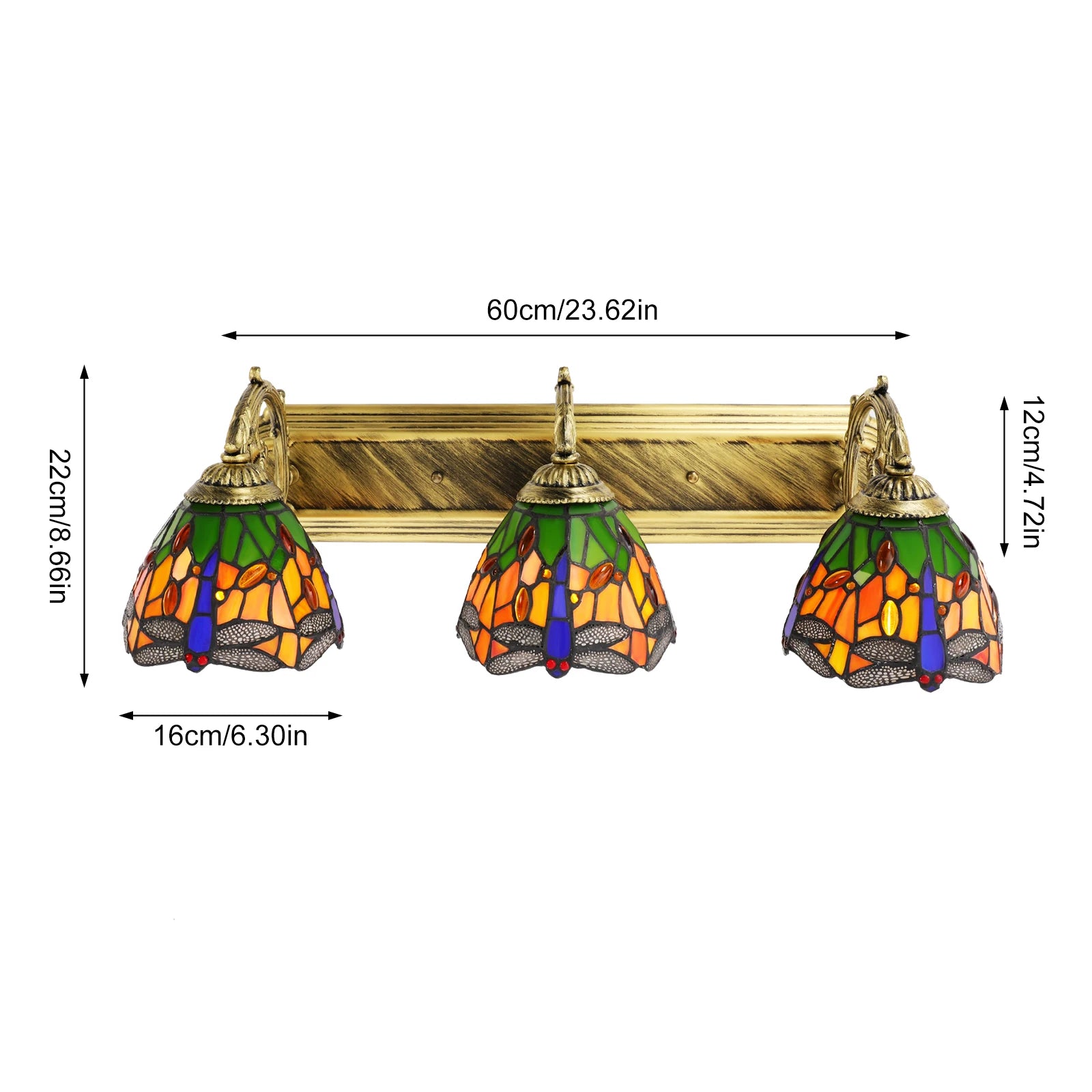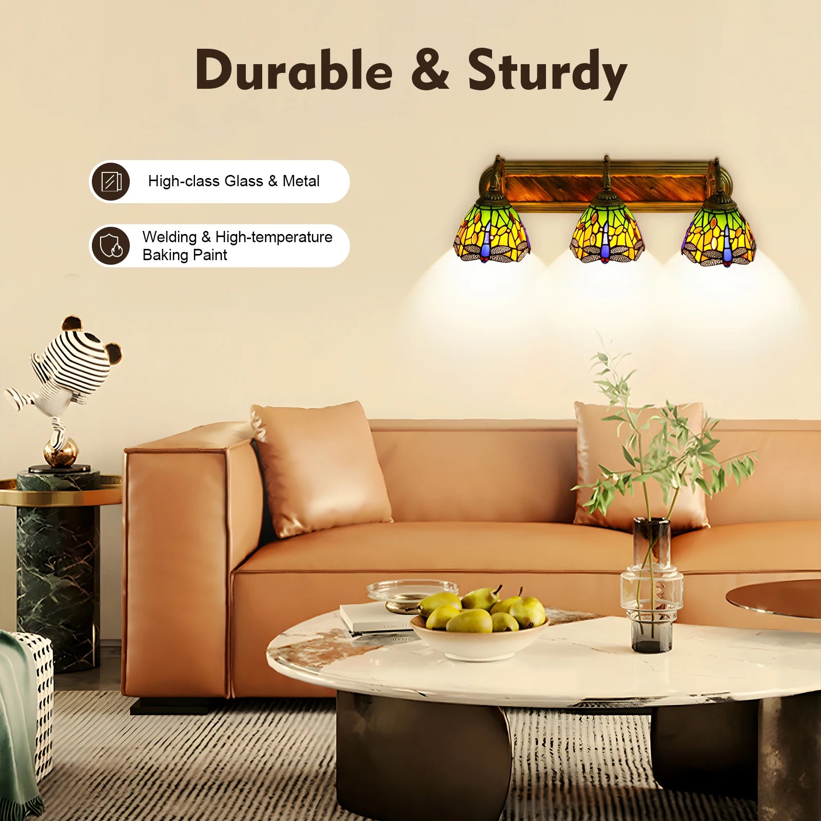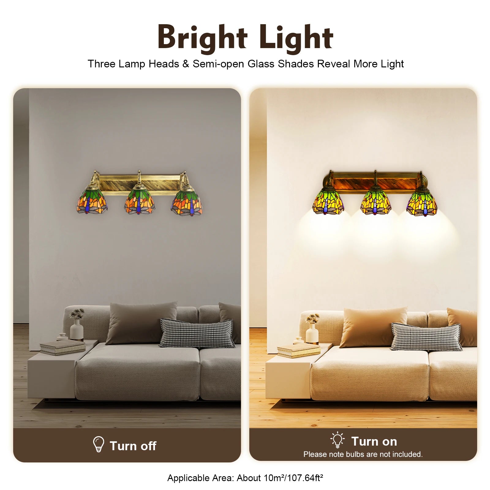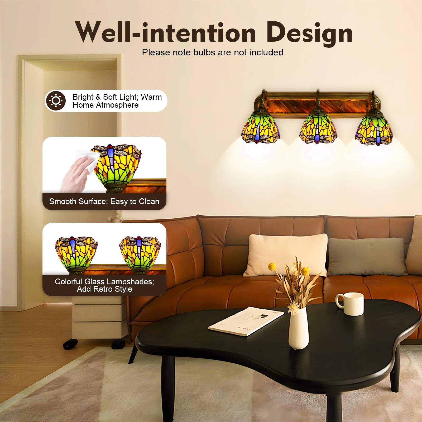 - Three-light design with dragonfly-patterned glass shades creates a warm, ambient glow for your living room, bedroom, or hallway.