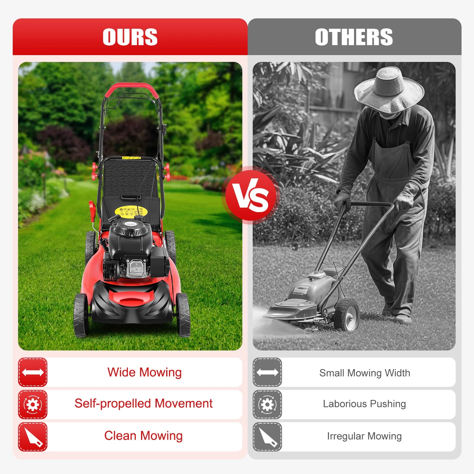 - Self-propelled design reduces effort as you mow, powered by a 140cc four-stroke engine delivering up to 5 HP and 2800 rpm for steady propulsion.