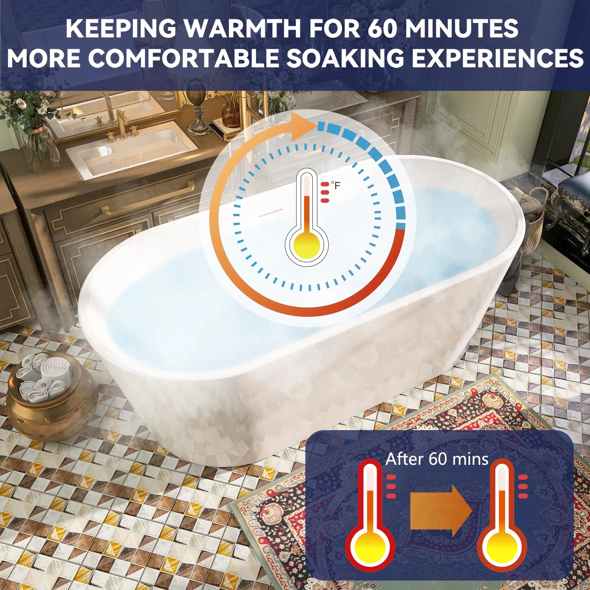 - Spacious oval tub measures 59" L x 31.5" W x 23" H with a generous 77-gallon capacity, crafted in durable acrylic for warmth and longevity.