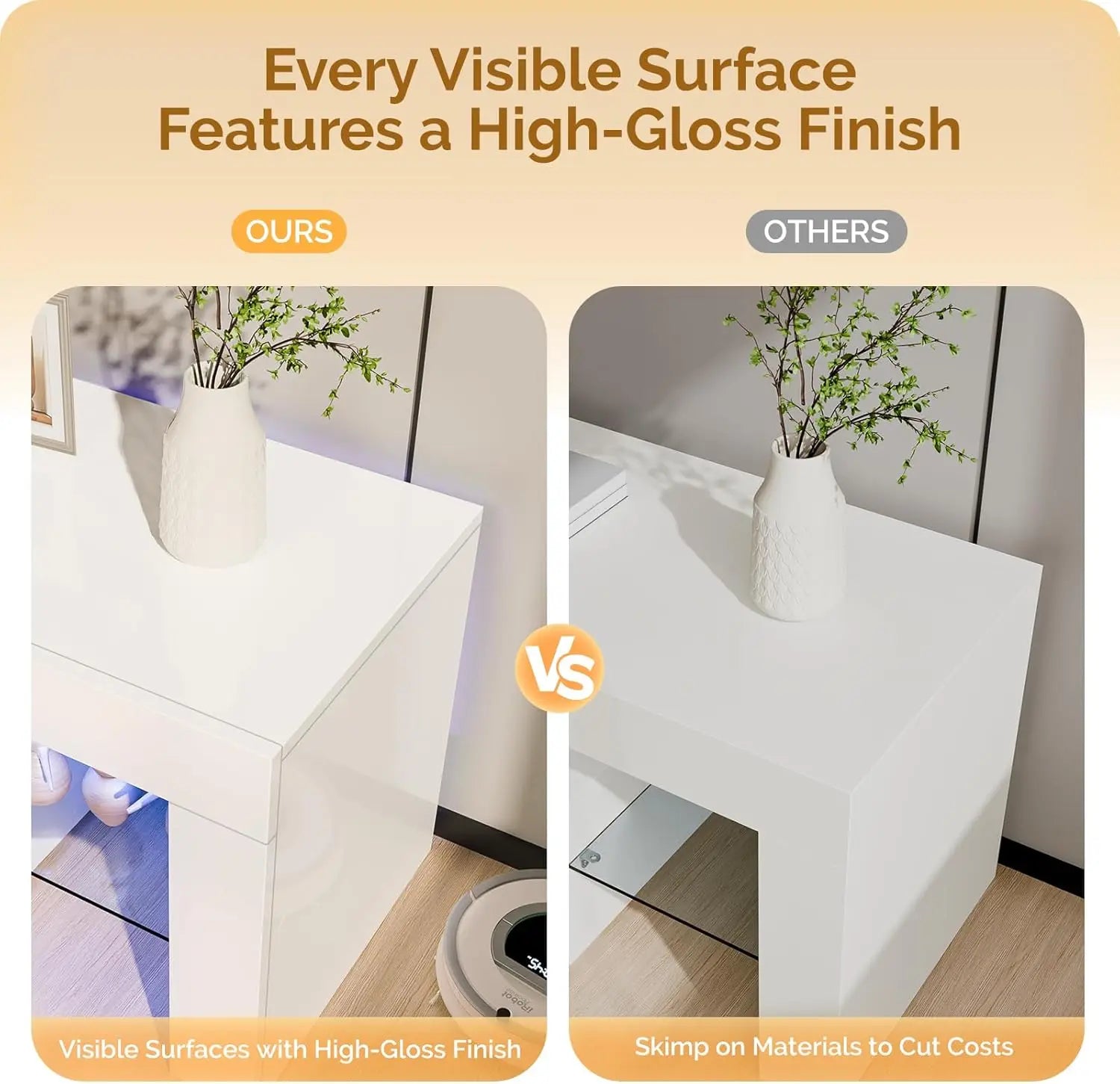 - 63'' white high-gloss TV stand with blue LED lighting, so you can showcase media gear on two glass shelves, plus a subtle night-light effect to set the mood.