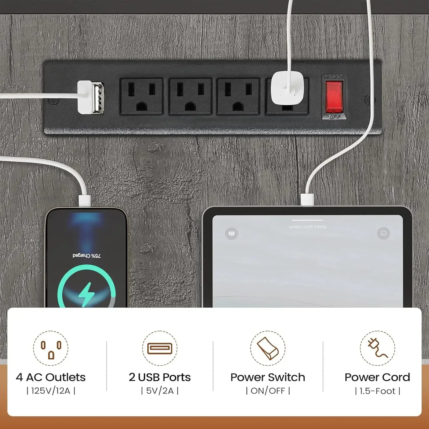 - Built-in power outlets reduce clutter by letting you power your devices from a single station.