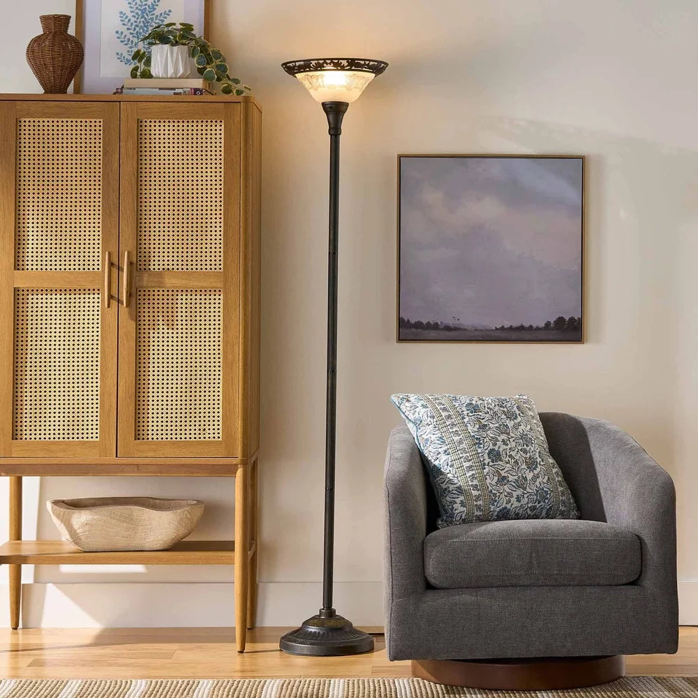- Your space gains classic style with a copper body and a refined torchiere shade that complements traditional decor and adds elegant warmth.