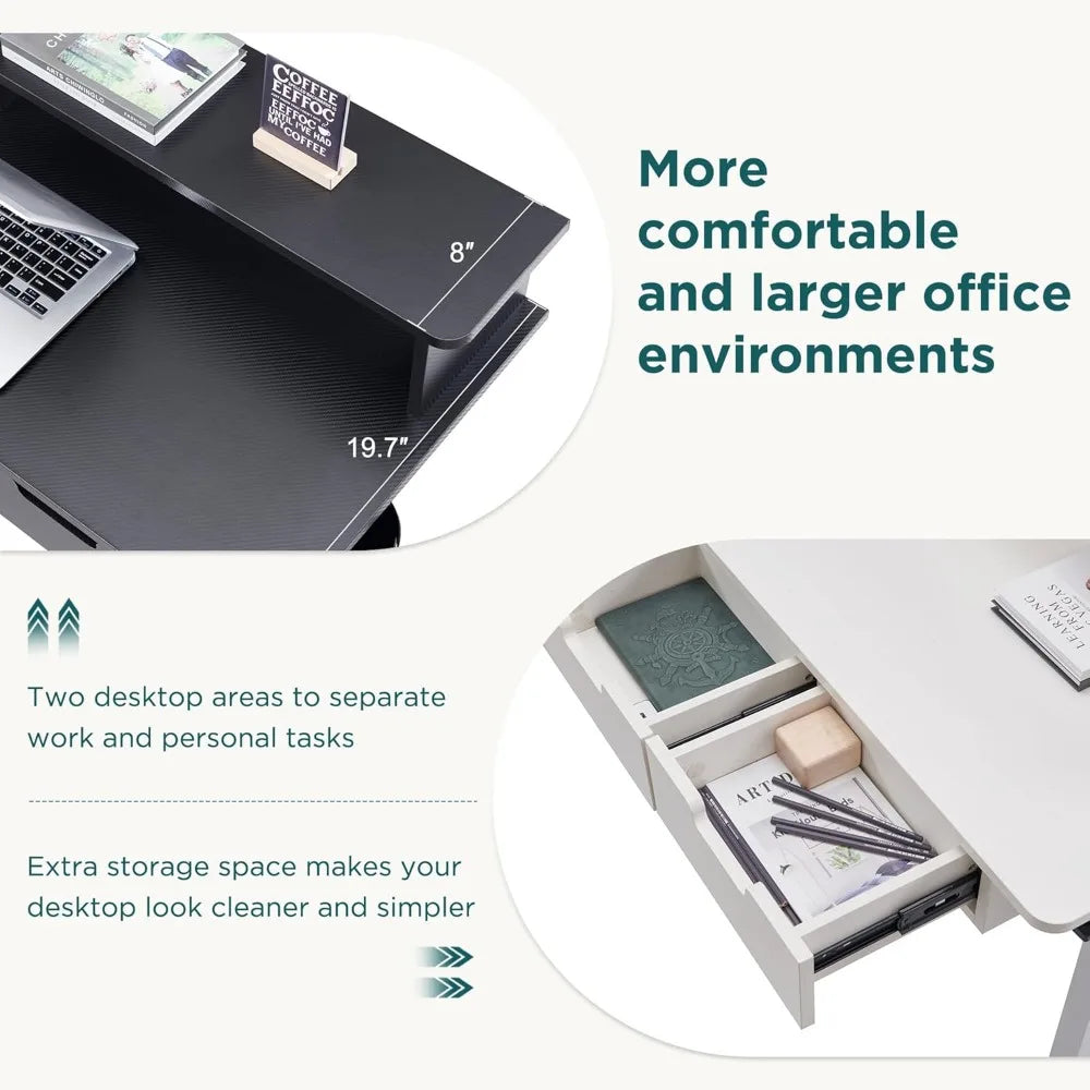 - L-shaped footprint includes two integrated drawers for organized storage of documents, peripherals, and daily essentials.