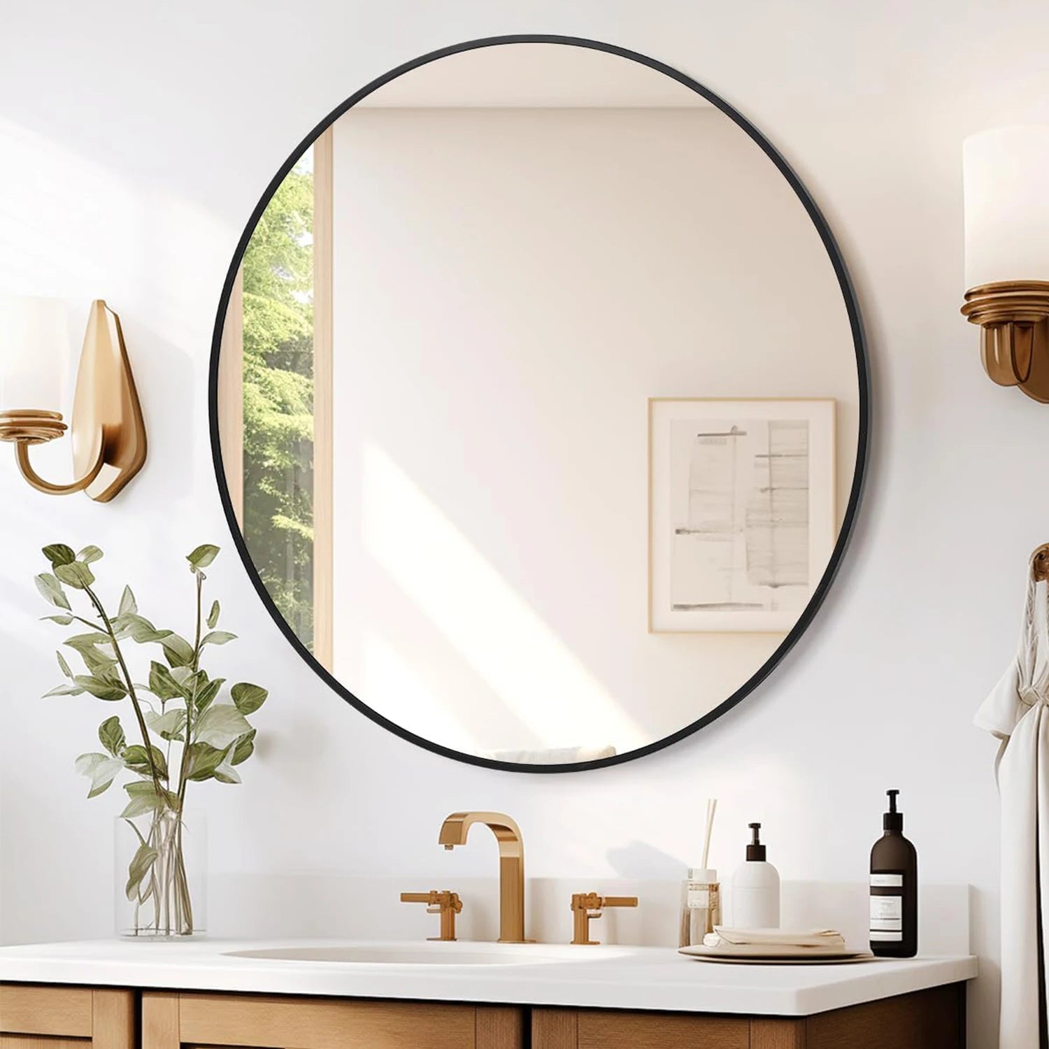 Elevate your space with the HiMISS round aluminum alloy bathroom mirror, where a contemporary resin frame meets practical, crystal-clear reflection.