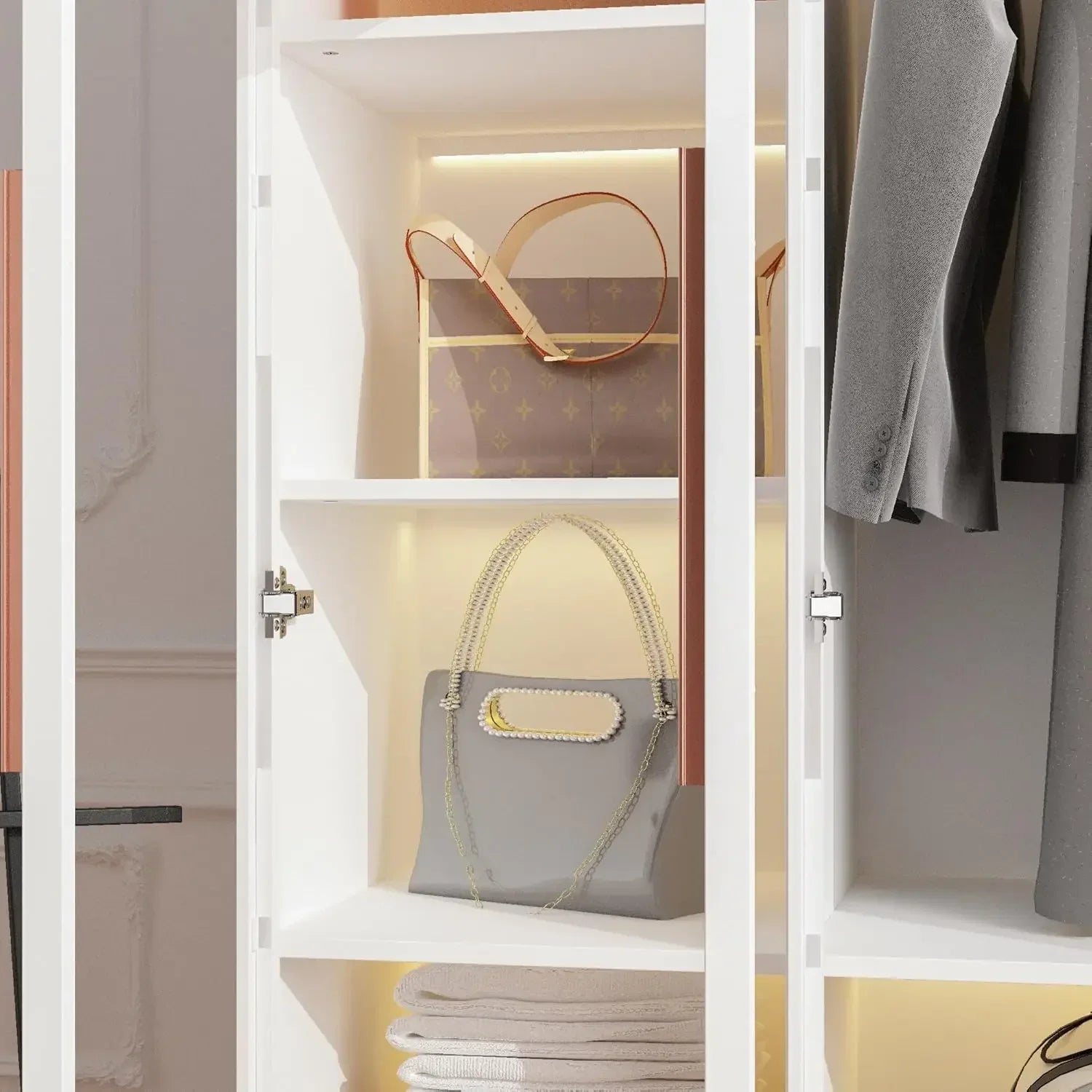 - 5-tier storage with 6 glass doors keeps your items organized and dust-free, while integrated LED lighting highlights every detail.