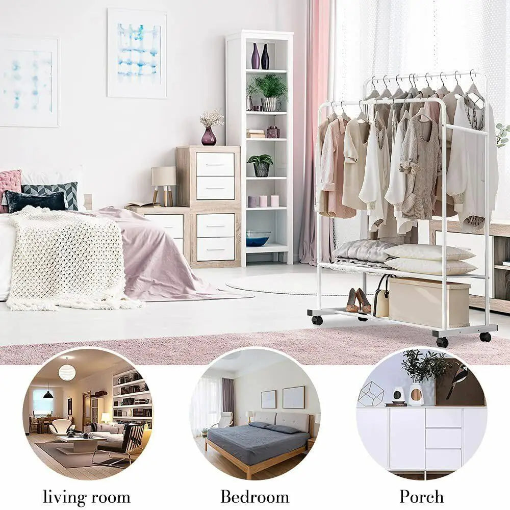 Transform your space with the Hign-concerned Double Rail Rolling Garment Rack Stand—compact, sturdy, and perfect for everyday organization.