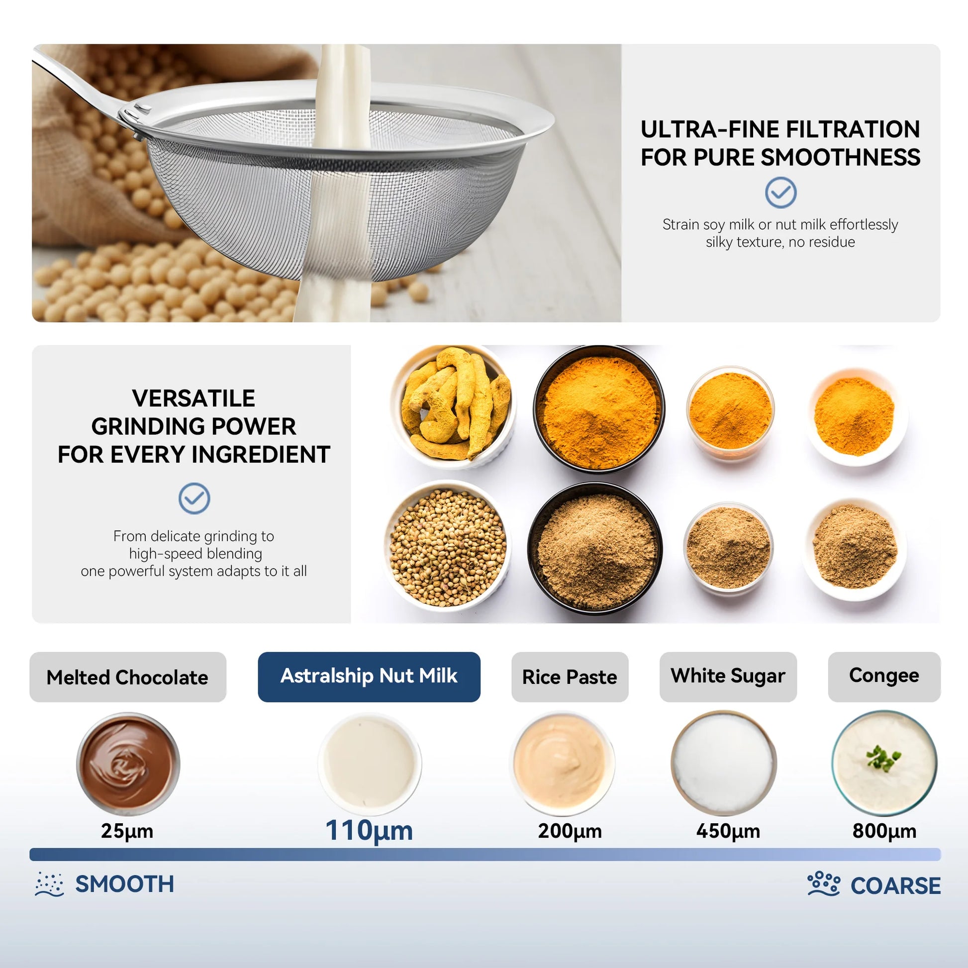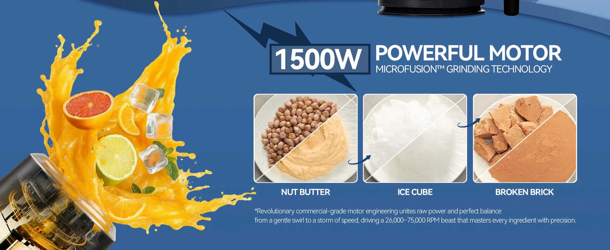 - Powerful 1500W motor paired with an upgraded 8-blade 304 stainless steel assembly delivers fast, consistent pulverization of ice, frozen fruit, nuts, and fibrous vegetables for silky textures.