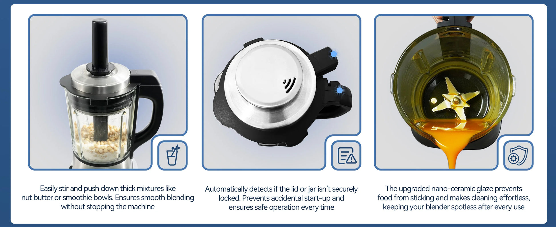 - Easy cleanup with a nano-ceramic non-stick bottom and 158°F auto-clean mode; safety protections include overheat (E3), lid-lock (E2), and a leak-proof silicone gasket for mess-free operation, ideal for nut butters, protein shakes, and creamy soups.