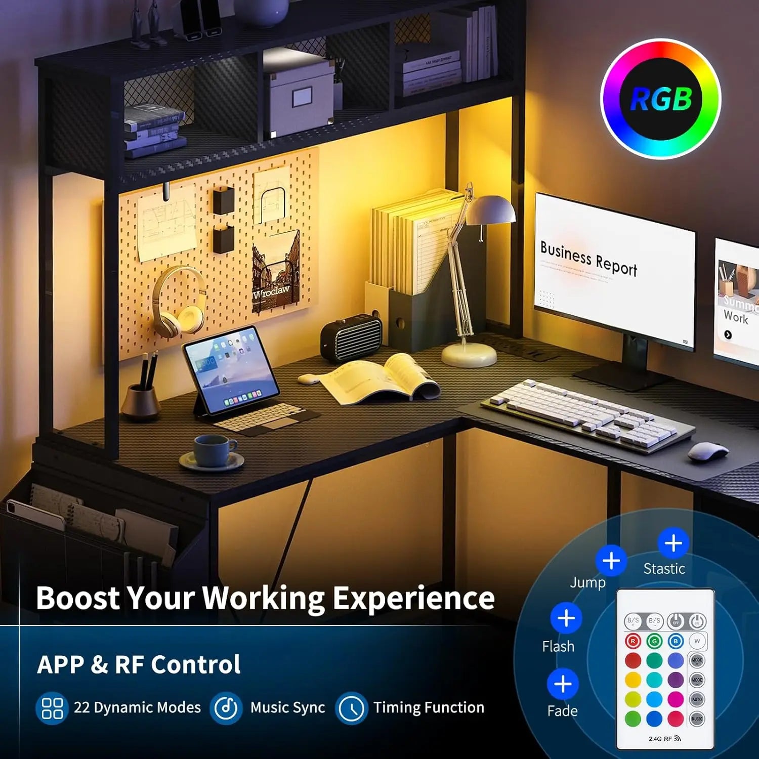 Upgrade your gaming setup with the Hign-concerned L-shaped desk featuring vibrant RGB LEDs and a sleek LED drawer for immersive play.