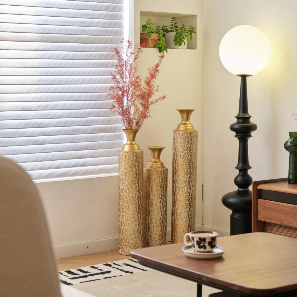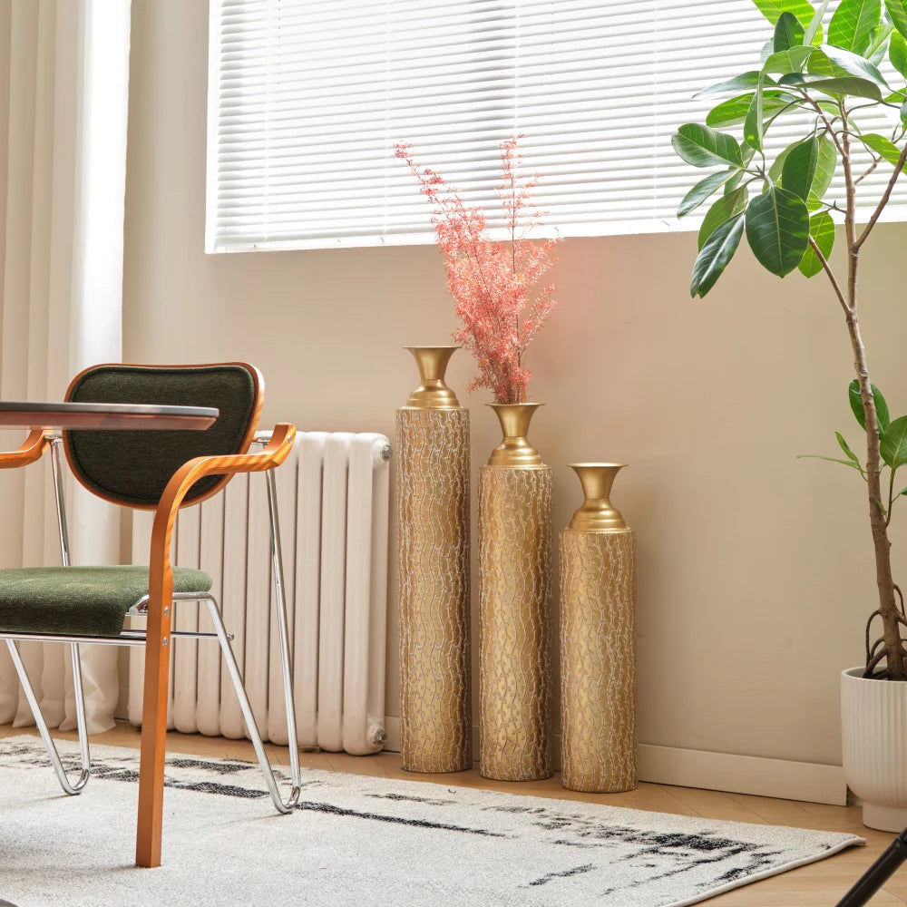 Elevate your space with the Hign-concerned Metal Decorative Vase, a statement piece featuring growing vine patterns in an antique gold finish.