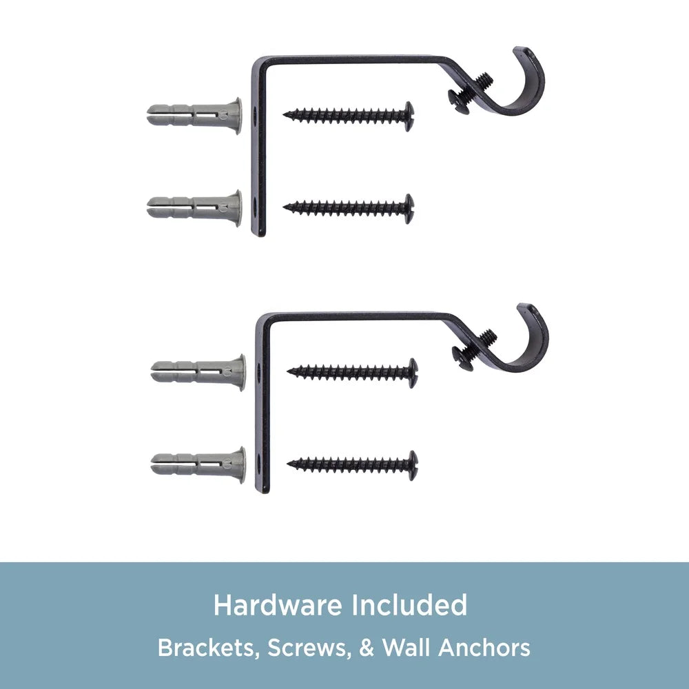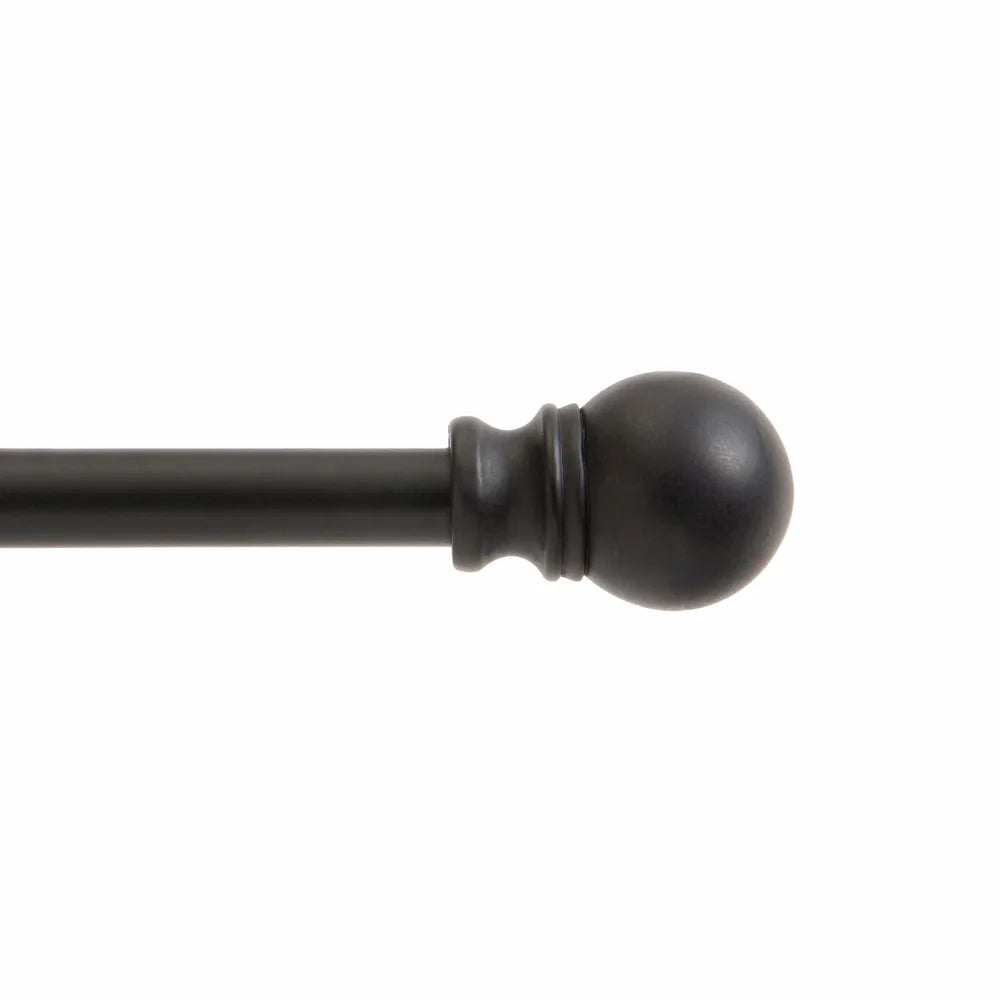 - Durable finish and hardware features a steel rod in a matte black finish with decorative ball finials; includes two brackets, screws, drywall anchors, and installation instructions.